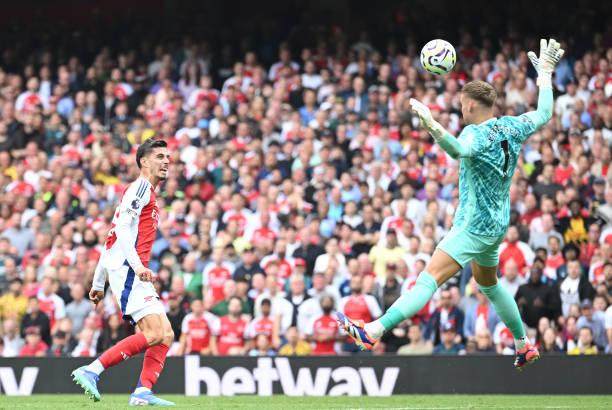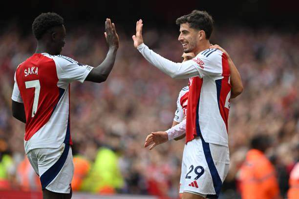 不过比赛却并未在此后变得一边倒。欣谢尔伍德和三笘薫开始轮流用更加激烈的身体对抗来限制萨卡,而主裁判卡瓦纳对此无动于衷,随着双方拼抢的尺度越来越大,比赛也逐渐陷入胶着状态。布莱顿见状逐渐将阵型前移,反倒让阿森纳开始获得更多的反击机会。第38分钟,布莱顿在一次任意球进攻中倾巢而出,萨卡将队友解围出来的长传第一时间将球挑到禁区前沿,直接帮助哈弗茨面对出击的布莱顿门将费布吕亨,德国球星以一脚精准的吊射将皮球送进空门,1比0!