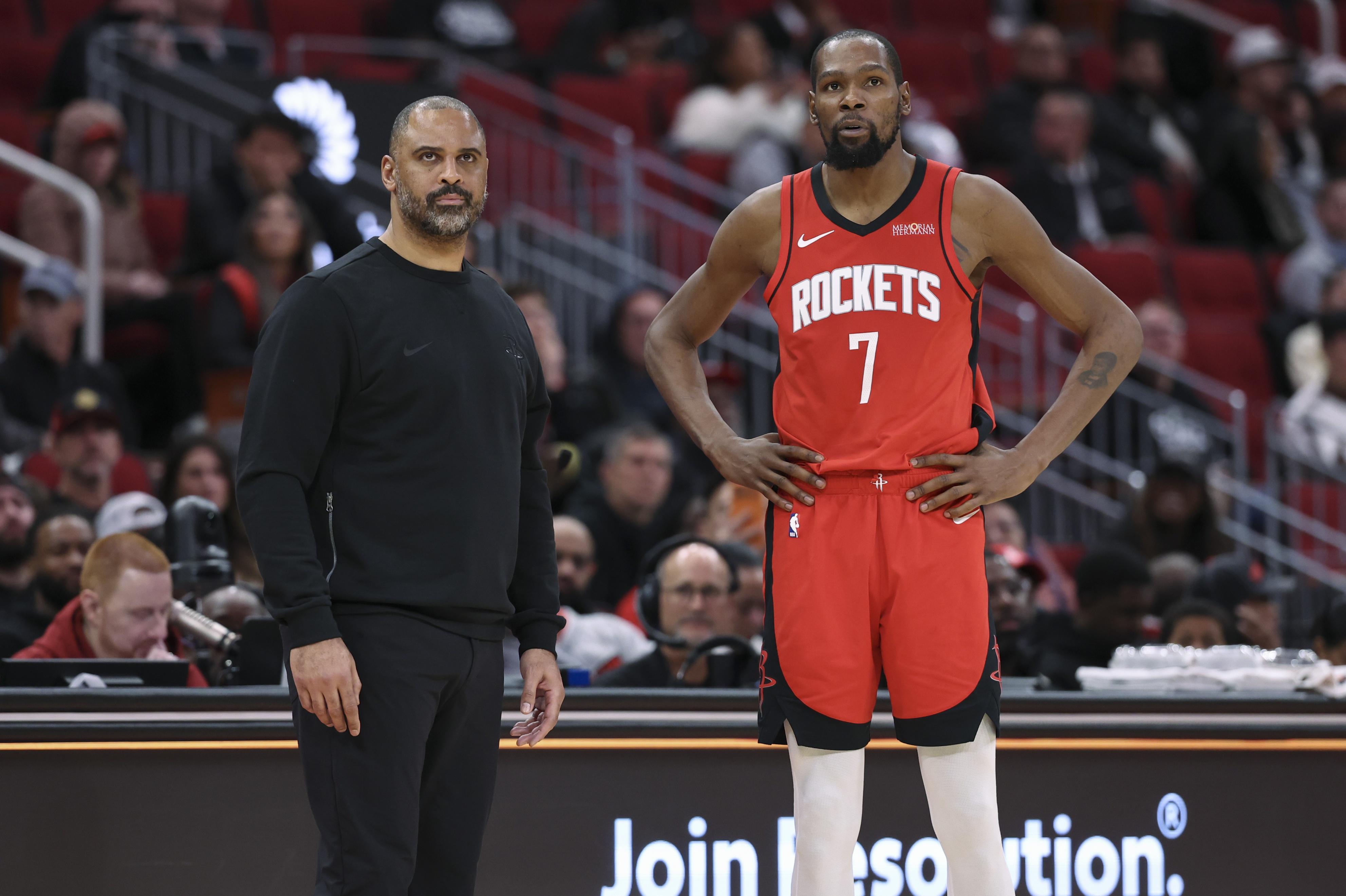结果两套进攻战术的核心球员均缺席,加上侧翼伊森、芬尼史密斯也缺阵,火箭队拿手的防守反击也缺少核心组件,导致乌度卡进攻端只能依赖杜兰特这个强解点破局。